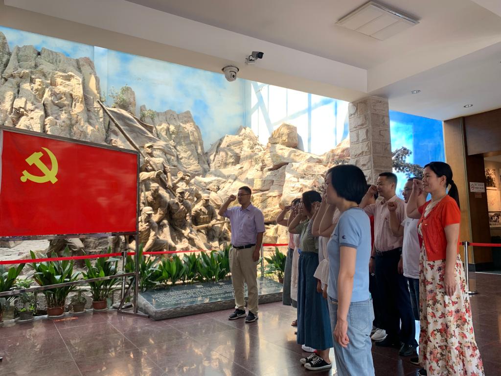 在纪念馆内,面对鲜红的党旗,党总支书记汤波带领大家重温了入党誓词。在庄严的宣誓中,全体党员坚定了不忘初心、牢记使命的决心。