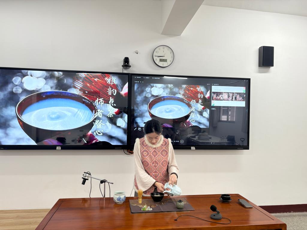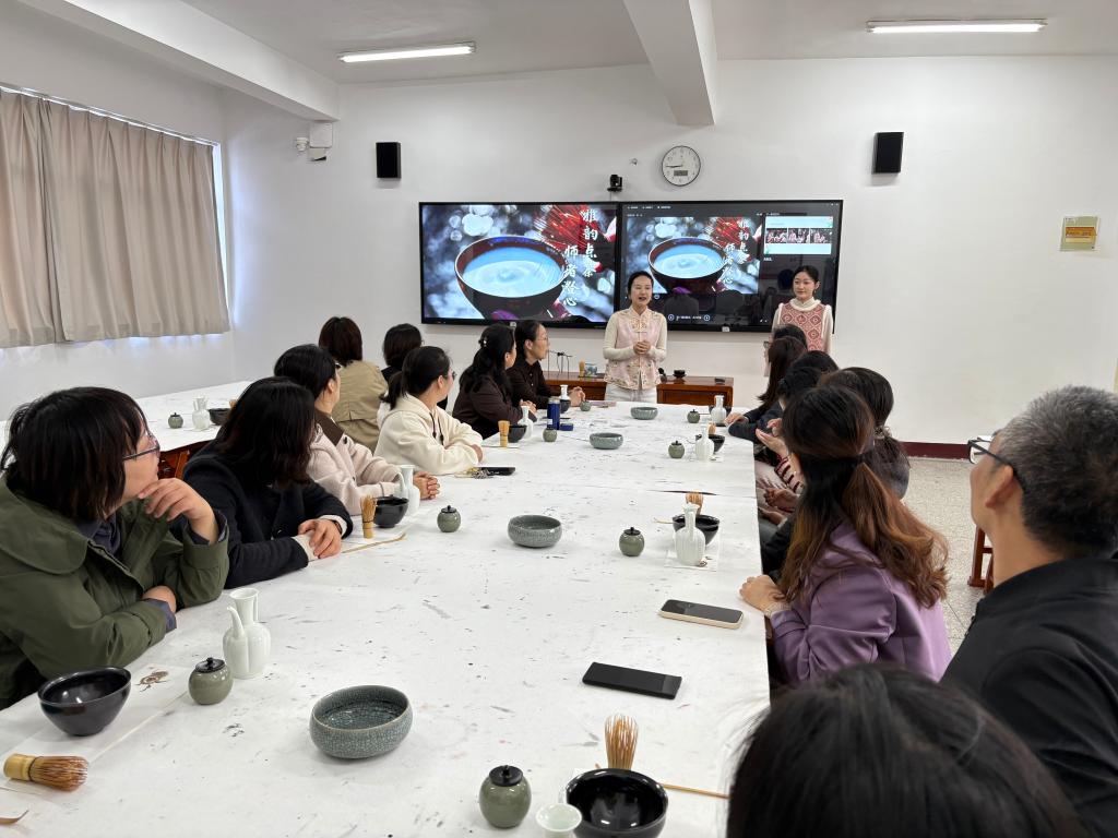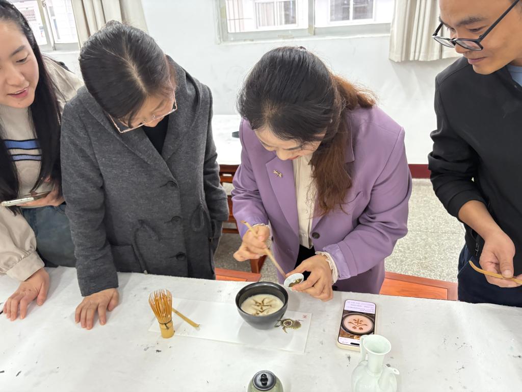 最令人沉浸的是亲手点茶环节。教职工们两人一组,在讲师的悉心指导下,亲手执筅击拂,体验从茶粉到茶汤的蜕变过程。茶香氤氲中,大家不仅掌握了点茶的基本技艺,更在静心点茶的过程中,体味到“慢下来”的智慧——正如教书育人,需要耐心、专注与持续的精进。