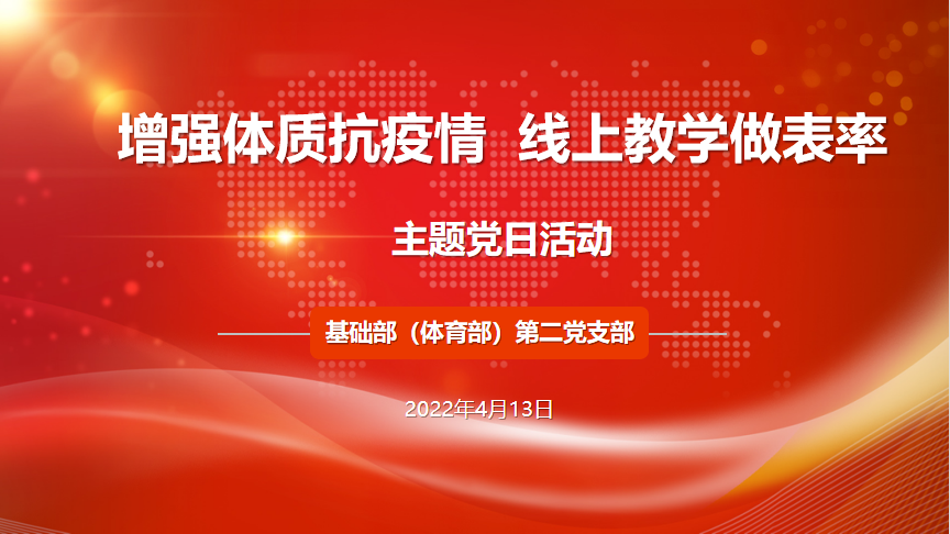 4月13日基础部(体育部)党总支第二党支部组织教师开展线上“增强体质抗疫情,线上教学做表率”主题党日活动。会议由邓书记主持,全体党员教师参加。